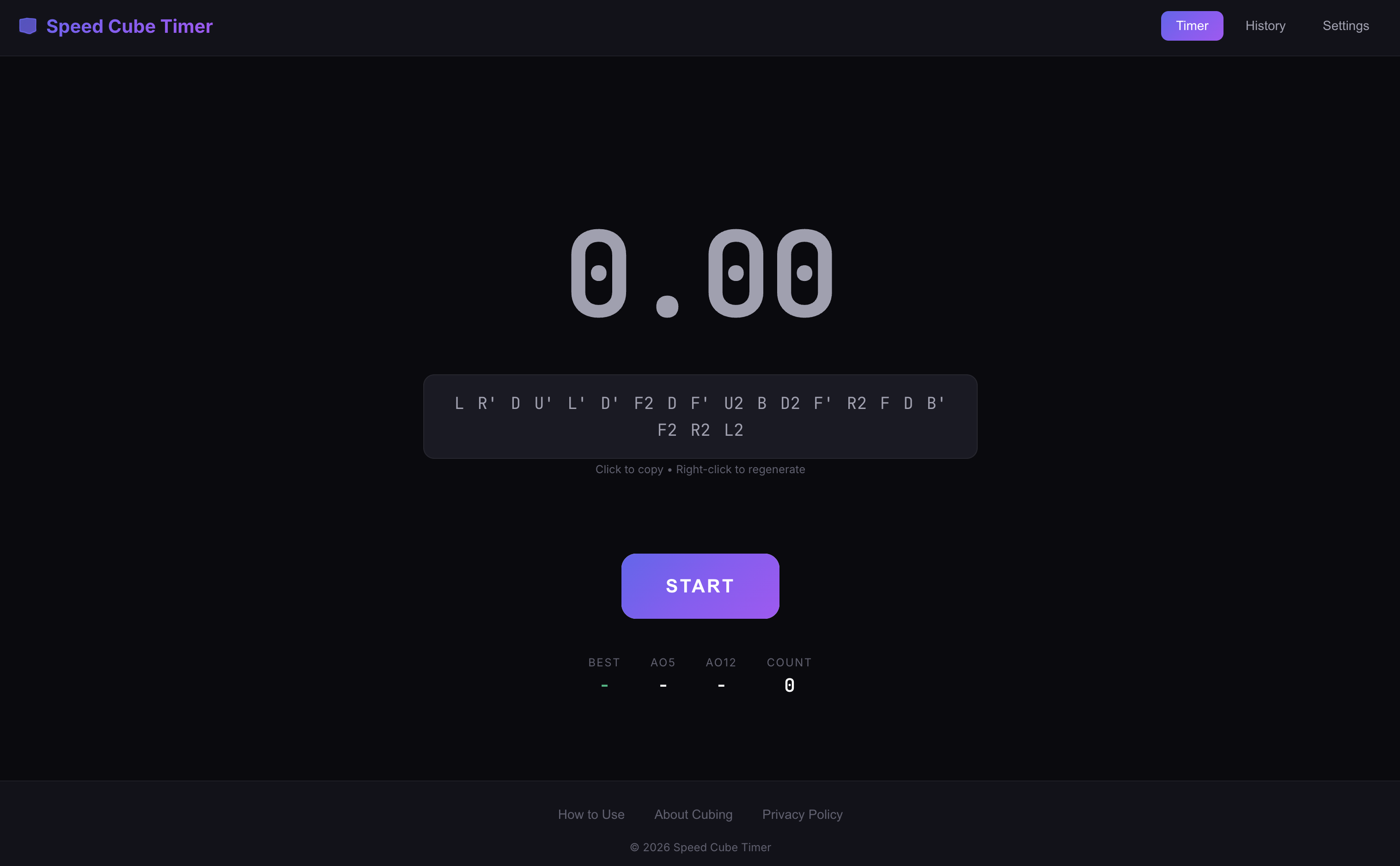 スピードキューブの練習用に、ブラウザで動くモダンなタイマーアプリ「Speed Cube Timer」を開発しました。 WCA準拠のスクランブル、インスペクションタイムに対応しています。
